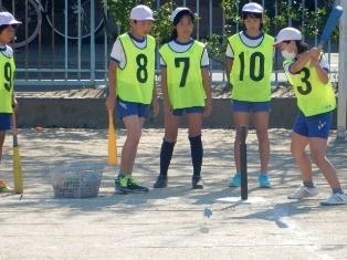 6年生の体育で、Tボールの授業です。ティーの上に置いた