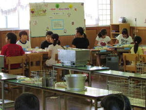 たちと食べる給食に大喜びでした。高学年の児童が低学年の児童の面倒を見ながら