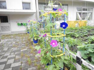 下は、教室棟にあさがおで作った綠と花のカーテンです。