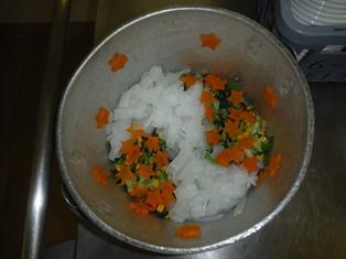 こんにゃくサラダのにんじん、スープのにんじんとオクラは