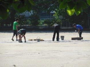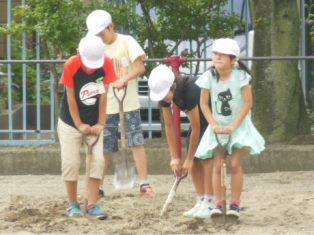 校庭の砂場では、運動委員の人たちが砂を掘り起こしています。