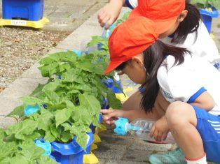 種をまき終わった子どもたちは興味津々、水くれに余念がありません。