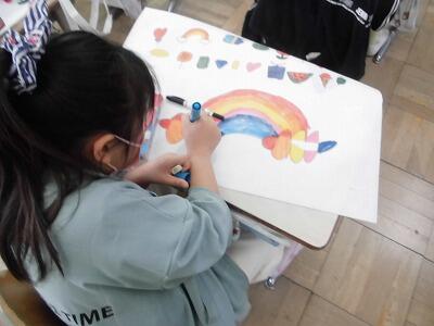 【1年生】1年間の思い出となる作品バックに絵を描きました。