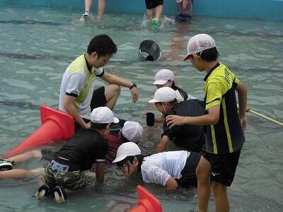 体育主任、教務副主任と校長とで、プールの排水溝のねじ締めを行いました。