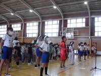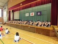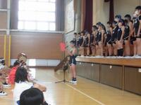 全校児童・教員が体育館に集まり、選手を激励しました。明日の陸上大会、全力を出し切ってきてください。応援しています。