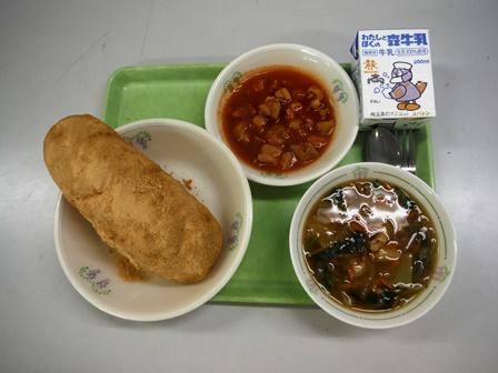 きなこ揚げパン、鶏肉のトマト煮、ワンタンスープ、牛乳です。