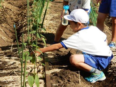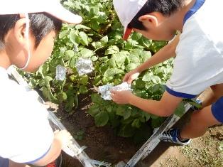 学校ファームでナスの様子を見ている2年生です。この間までなっていたナスは、早め