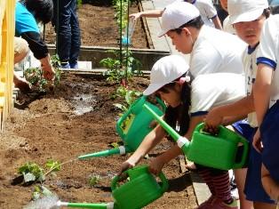 678組では、教室前の花壇を活用して野菜の苗を植え付け