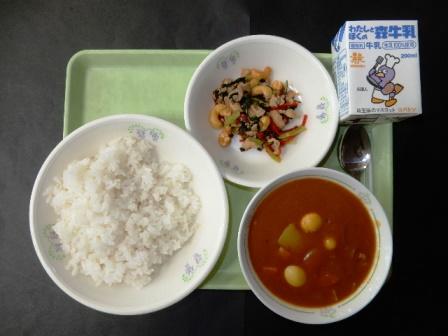 麦ごはん、カレールー、鶏肉とカシューナッツの炒めもの、牛乳です。