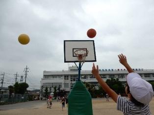 低学年の子どもたちが小さめのボールを使ってシュートを放っています。