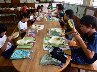 6年1組と3年1組の交流給食の様子です。6年生が手際よく