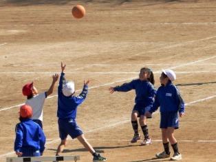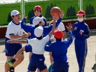 こちらは3年生の体育です。バスケットボール型の球技です。