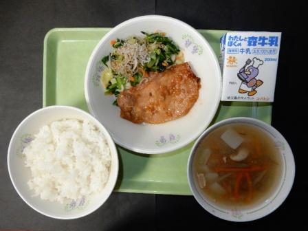 ごはん、豚肉の金山寺みそ焼き、青菜とジャコのごま醤油あえ、みぞれ汁、牛乳です。
