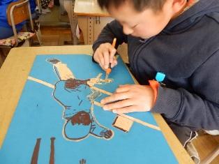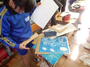 6年生の様子です。集中して丁寧に彫り、刷っています。