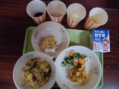 今日の献立 秋の香りごはん、牛乳、さわらの万尾焼き、切り干し大根の炒め物
