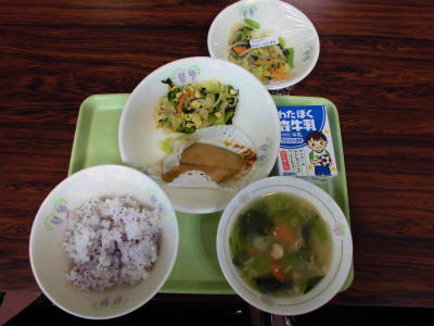 ゆかりごはん、牛乳、さわらの幽庵焼き、千草炒め、鏡開き雑煮
