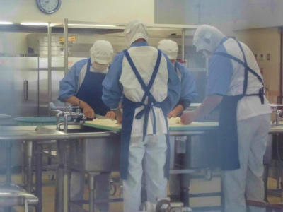 朝の給食室では、野菜を刻んでいます。