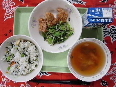 7月2日(金)本日の給食 投稿日時 : 2021/07/02 豊春小学校管理者 カテゴリ: 枝豆入りわかめごはん 牛乳 とり肉の唐揚げ ごま酢和え トマトのみそ汁 学校給食のから揚げは、どうしてこんなに美味しいのでしょう!