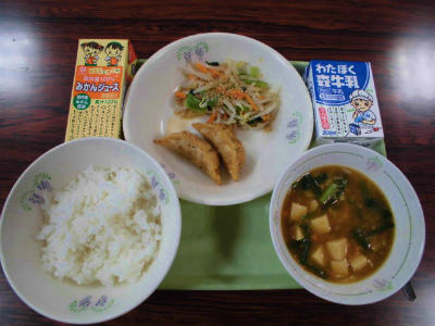 ごはん 牛乳 彩の国ねぎみそ餃子 ナムル マーボー豆腐 (交流給食:みかんジュース)