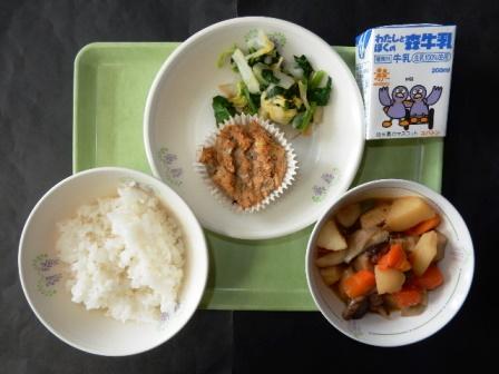 ごはん、ツナの焼きさんが、白菜のおひたし、筑前煮、牛乳です。