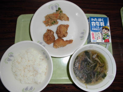 本日の給食は、ごはん、牛乳、とり肉の唐揚げ、卯の花の炒り煮、沢煮椀でした。