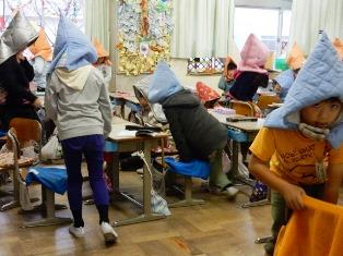 避難訓練ショート 投稿日時 : 2015/12/11 豊春小 カテゴリ: 今月の避難訓練ショートは、朝の会に行いました。緊急地震速報音が流れると、素早く机の下に隠れます。その後、防災頭巾をかぶって、廊下に整列し、終了です。わずかな時間ですが、毎月1回、実施しているので、行動が機敏になってきました。学校以外でも、身に付けた避難行動で、自分を守ってほしいと思います。