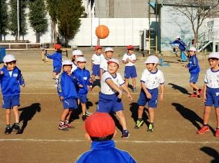 準備運動の後、ドッジボールです。大きな歓声があがっています。