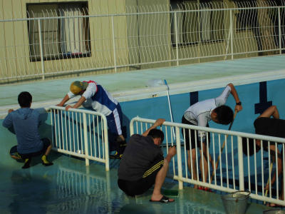 豊春小教職員は、交通安全教室の準備とプール掃除の仕上げを行いました。