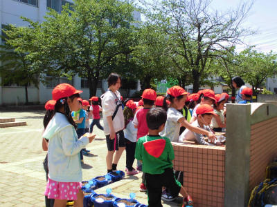 5連休後、植物に水をあげるために、水場に並ぶ1年生の姿です。