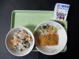 わかめごはん、チーズカツ、きのこサラダ、牛乳です。