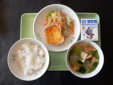 ごはん、和風卵焼き、はくさいのアーモンド和え、みそ汁、牛乳です。