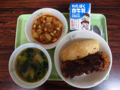 二色揚げパン 牛乳 ポークビーンズ ワンタンスープ