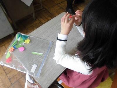 【1年生 生活科】1年生を迎える会で新1年生にプレゼントするアサガオの種の準備をしました。