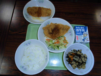 きょうの献立 ごはん、牛乳、わらじカツ、キャベツのからしあえ、凍り豆腐の煮物