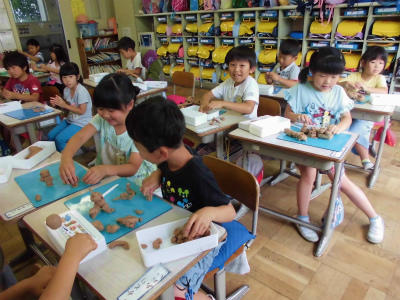 1年生 粘土をこねて、自分の好きな物を制作中です。子どもの喜ぶ大好きな活動の一つです。友だちと一緒に製作している子どももいました。