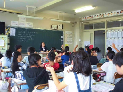 3年生英語活動。JTEと担任が二人で授業を進めます。映像を見ながら学習しています。