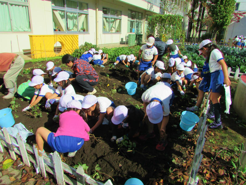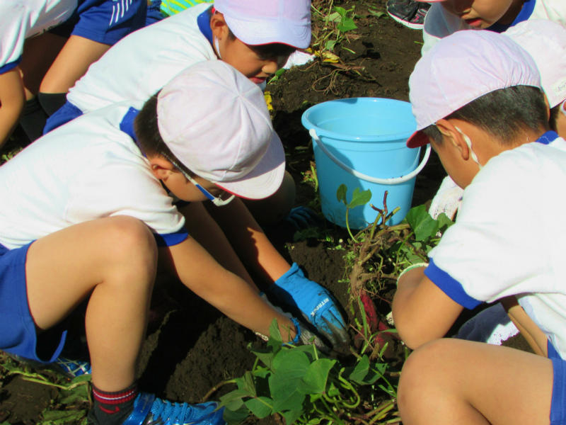 すばらしい秋空の下、2年生が育ててきたさつまいもの収穫を