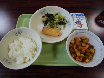 献立は「ごはん、牛乳、いかの照り焼き、おひたし、野菜のうま煮」です。