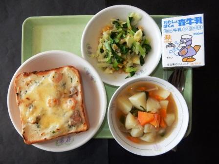 本日の給食 投稿日時 : 2017/01/24 豊春小 カテゴリ: シーフードグラタントースト、コーンサラダ、ジャガイモのコンソメスープ煮、牛乳です。シーフードグラタントーストを初めて食べましたが、大変美味しきういただきました。調理員の皆さん、美味しい給食ありがとうございます。