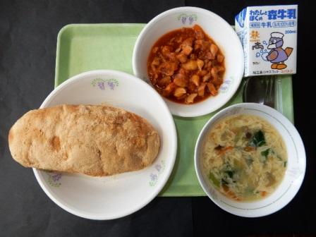 きなこ揚げパン、蓮花湯、鶏肉のトマト煮、牛乳です。