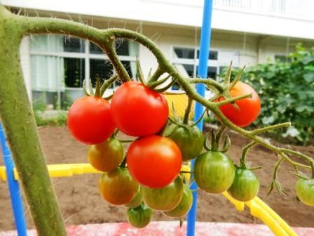 2年生が育てているミニトマトが赤く色づきました。
