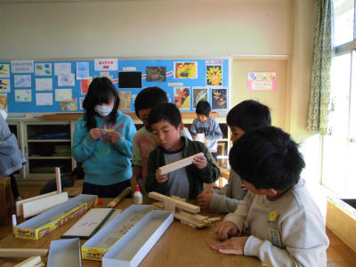 特別教室の様子 投稿日時 : 2019/01/24 豊春小 カテゴリ: 家庭科室では、5年生が衣服の働きについて学習しています。図工室では、3年生がのこぎりを使ってざくざく木片を切り、思い思いの作品を作っていました。理科室では、5年生が大きなビーカーも使いながら、物が溶ける様子を観察しようとしていました。音楽室では、3年生がわらべ歌を歌って体を動かしながら音楽を楽しんでいました。