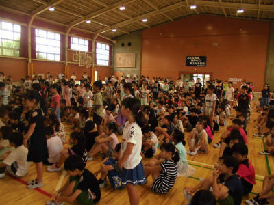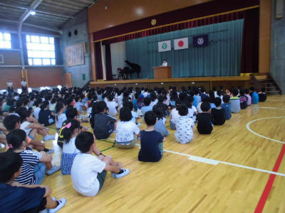 校長講話です。きょうの大切(通知表を家の人とよく読んで、自分の得意と苦手を見つけること)、夏休みの大切(時間の使い方)、2学期の大切(運動会スローガン)についての話でした。