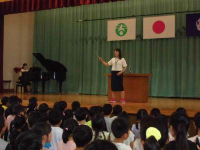 全校児童が一緒に校歌を歌いました。令和初の校歌斉唱です。