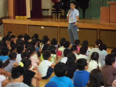 夏休みの生活について、お話を聞きました。火遊びはしないこと、水の事故に注意すること、不審者に注意すること、校外での過ごし方のルールを守ることについて、「4つの車にお世話にならないように…出合わないように…。」と先生が話したので、イメージを持ちながら聞くことができました。