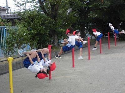 【1・3・6年生 体育朝会】1年生は、鉄棒や雲梯、ジャングルジムを行いました。3年生は、8秒完走を行いまし