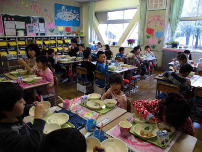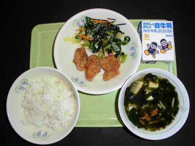 本日の給食 投稿日時 : 2016/04/28 豊春小 カテゴリ: ご飯、鳥肉の唐揚げ、すまし汁、磯香あえ、牛乳1年生もおいしく食べています。からあげのおかわりじゃんけん!どの子も好き嫌いなく、おかわりをしています。