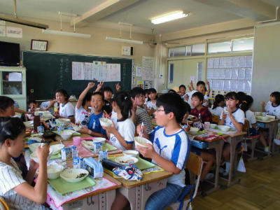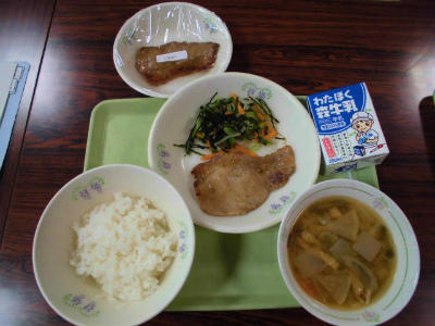 ごはん、牛乳、豚肉のオイスターソース焼き、磯香和え、こしね汁