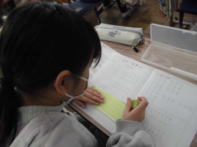 4年生が、点字で名前や学校名、好きな食べ物などを打つことに挑戦しました。