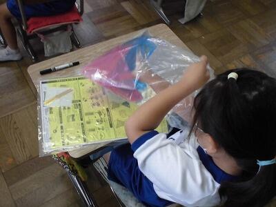 【1年生 図工】思い思いに色セロハンを袋に詰めました。